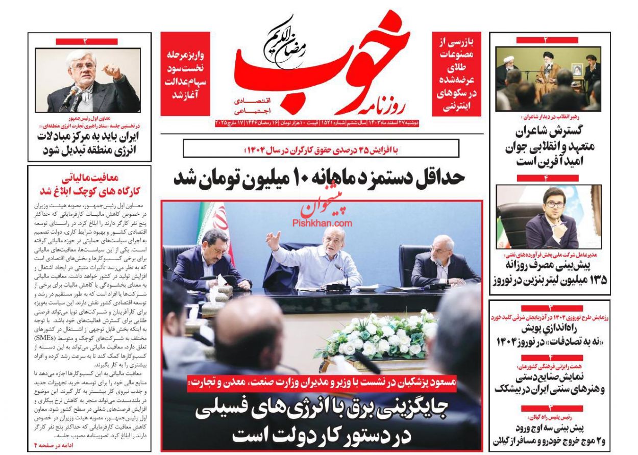 گزارش صفحه اول روزنامه خوب به بررسی جدیدترین مصوبه دولت درباره افزایش 45 درصدی حقوق کارگران اختصاص دارد